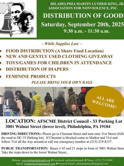 The King Association provides food for families in need through the Share Food Program. Distribution is held every 3rd Saturday of the month from 9:30 a.m. to 11:30 a.m. while supplies last. PLEASE SEE OUR FACEBOOK PAGE (PHILADELPHIAMLK) FOR UPDATES AND CHANGES.